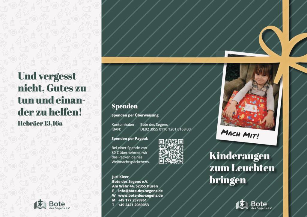 Wir möchten euch herzlich einladen, ein Teil unserer Weihnachtspäckchenaktion zu sein. Unsere Päckchen sind insbesondere für Waisenkinder in der Ukraine und in Moldawien gedacht.